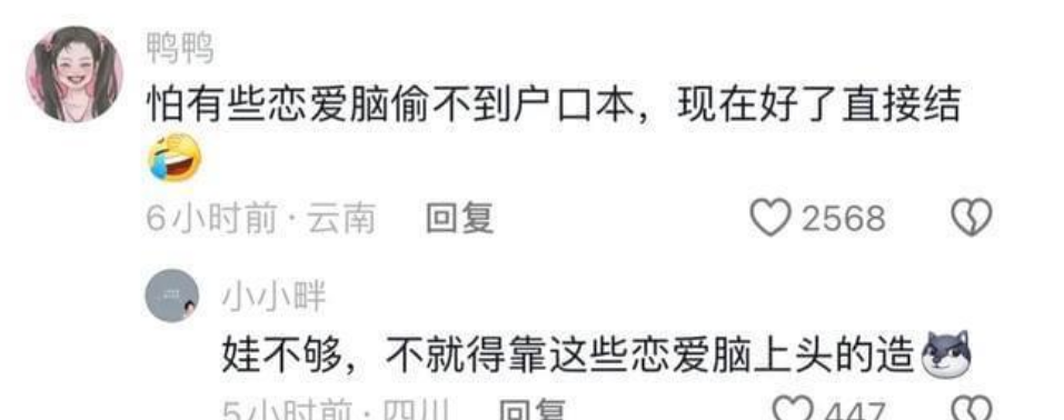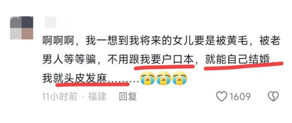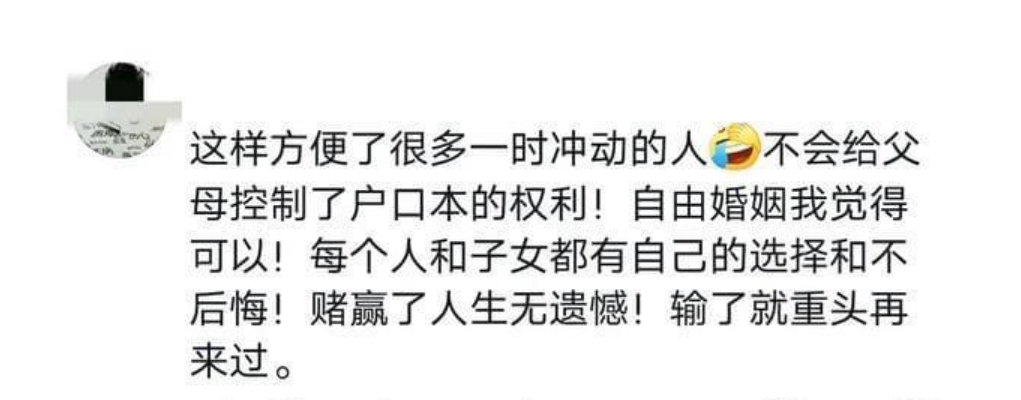 有站在母親角度憂慮的:作為有女兒的媽媽,萬一女兒被哄騙結(jié)婚咋辦?這樣的婚姻自由真的是自由嗎?一時上頭,換來一輩子的痛苦咋辦?