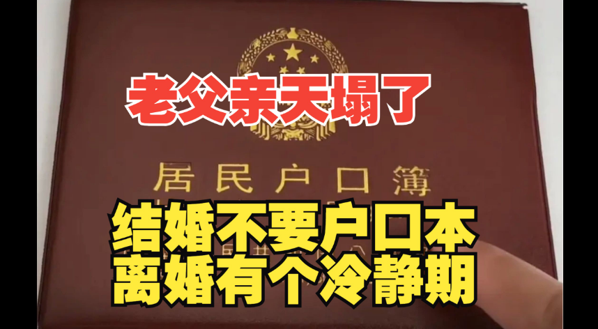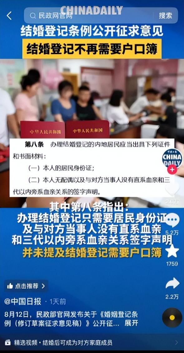 其實這個草案僅僅這樣看來,感覺也還好,這不是簡化了婚姻登記的程序嗎?對于某些高彩禮地區(qū)來說,登記不用戶口簿,那不是剛好繞過獅子大開口的丈母娘,支持“自由戀愛”?