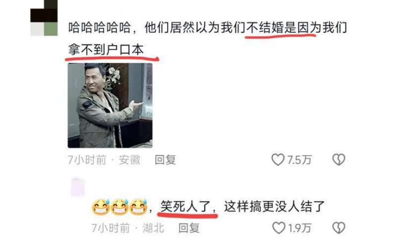 打定主意不結(jié)婚的網(wǎng)友甚至有些憤慨:我不結(jié)婚是因為拿不到戶口簿嗎?現(xiàn)在婚姻問題還不夠多嗎?高彩禮、低回報、感情淡漠、離婚困難,結(jié)婚一時爽,婚后火葬場??!